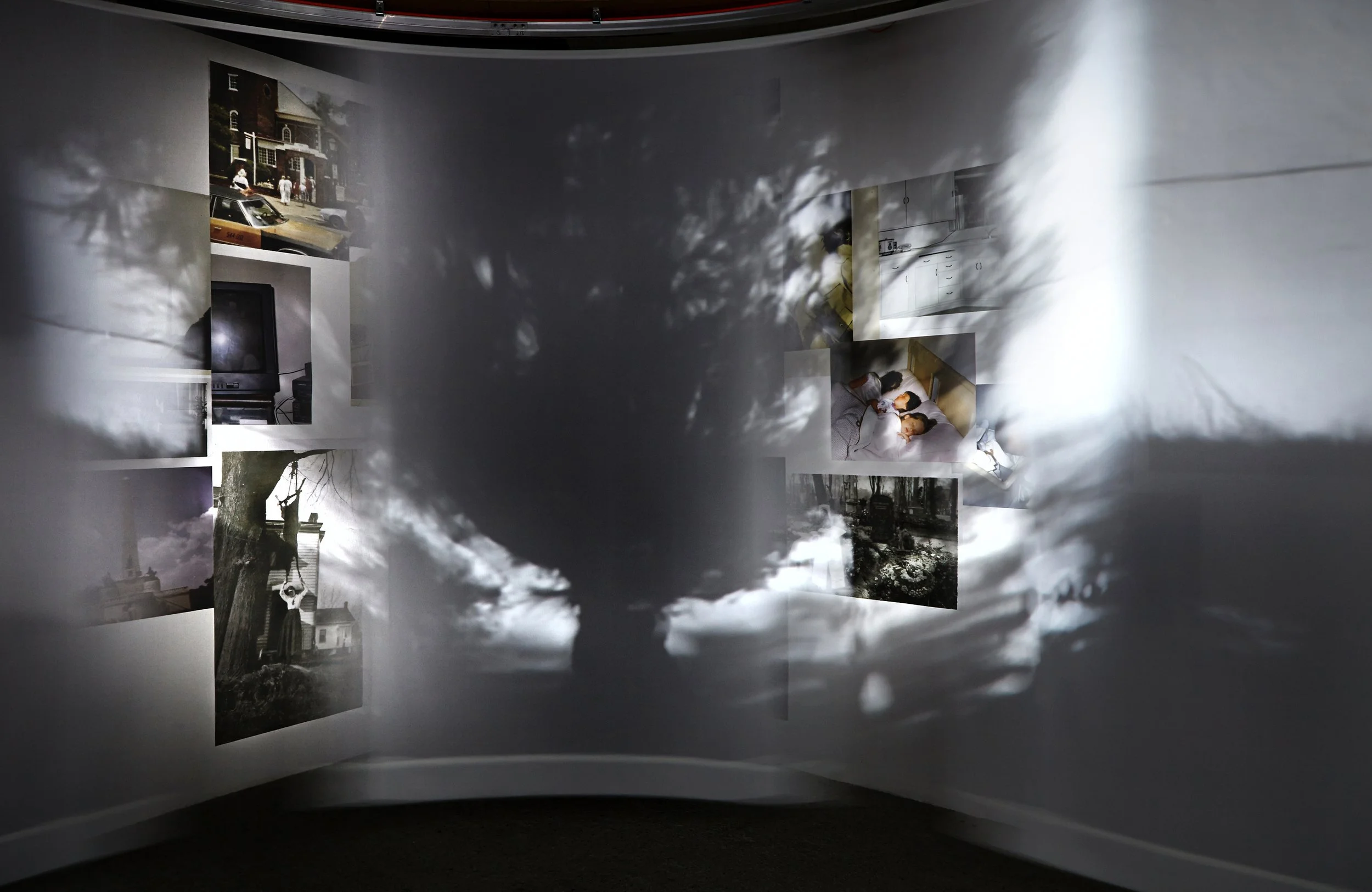 Mother is Passing…is made up of 6 video projections and sound tracks, 12 large photo collages, and 10 moving screens that circumnavigate the gallery on a specially built track. In Lee’s installation, the essential elements of cinema: picture, sound and motion, are turned on their head and rearranged. The pictures - giant collages - are still images; the curtains provide the motion for this “motion picture”. The projections lighting the piece, are made up only of shadows, filmed with Lee’s customized camera. The sound track providing a narrative for this dissected piece of expanded cinema is made up of found letters and fictional responses.